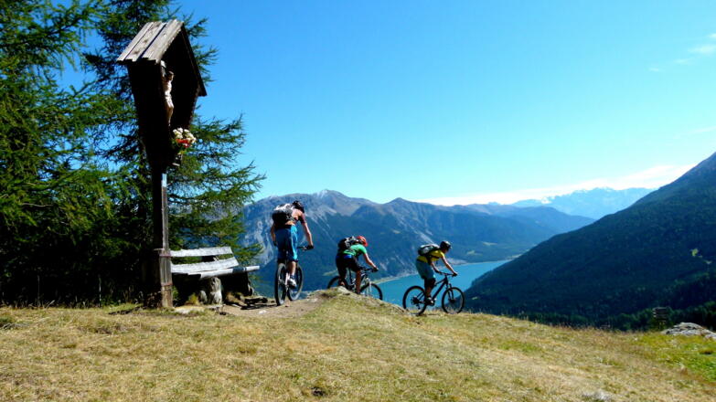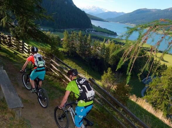 Um Reschen herum befinden sich zahlreiche Bunkeranlagen aus der Zeit der Anexion Südtirols durch Italien 1919 nach dem 1. Weltkrieg, die heute besichtigt werden können. Die Biker zieht es vor allem wegen der einmaligen Landschaft, den immer wieder kehrenden Blick zum Reschensee („Gardasee-Feeling“) und die genialen Trail-Abfahrten in diese Region.