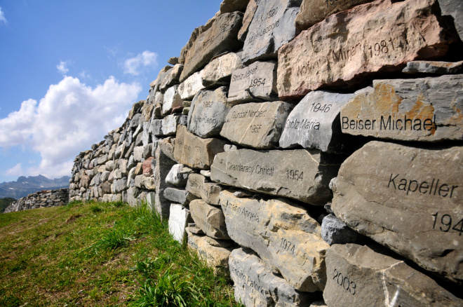 Für einmal gibt es entlang des Grünen Rings auch ein Phänomen, dem eine ganz plausible Erklärung zugrunde liegt: die Steinmauer in Oberlech, die seit dem Jahr 2010 die Namen aller Bewohner und Bewohnerinnen von Lech und Zürs archiviert. Die Leute bringen einen Kieselstein mit ihrem Namen und dem Geburtsjahr und ein kundiger Handwerker schichtet diese Steine zu einer Mauer aufeinander. Daran ist nichts Geheimnisvolles, es ist einfach eine kluge und hübsche Idee. Und in ein paar Jahrhunderten, wenn elektronische Daten sich für immer in Pixelsalat aufgelöst haben und Papier nur noch unter luftdichten Glashauben lesbar bleibt, wird diese Mauer eine beträchtliche Länge haben und die Namen der stolzen Bevölkerung werden Wind und Wetter trotzen. Sollten spätere Zivilisationen einmal in der Gegend Ausgrabungen machen, könnte es durchaus sein, dass die Menschen in ferner Zukunft nicht mehr viel vorfinden, außer eben dieser Namen – ein eindrucksvoller Beweis für ein zwar kleines, aber unbeirrbares Volk mit Weitblick.
