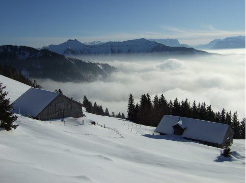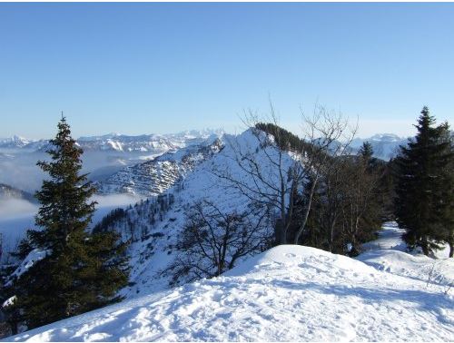 Dies geschafft, ist man am Spielberg (1.428 m) angelangt. Hinter dem Kreuz führt ein Weg im Wald Richtung Wieserhörndl (meist gespurt), dessen Aufstieg zum Gipfel wieder steiler wird. Am Wieserhörndl (1.567 m) wartet ein tolles Panorama - 450 Höhenmeter.