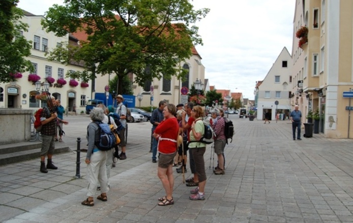 Lasciamo il Rathaus e percorriamo tutta la piazza verso Sud fino alla porta Frauentor, che attraversiamo; attraversiamo pure la Sonnengraben e scendiamo per 100m, poi giriamo a sinistra sulla scalinata poi via pedonale, che ci porta in riva al fiume Lech. Giriamo a destra e seguiamo la sponda destra del fiume fino allo sbarramento artificiale, che attraversiamo; continuiamo lungo il lago, girando a sinistra e arriviamo a lambire la zona industriale della città, dove giriamo a destra e iniziamo una lunga salita su asfalto, in foresta, che ci porta su un bel pianoro. Attraversiamo campi e prati ed iniziamo a scendere leggermente verso la cittadina di Peiting. Entriamo in città girando a destra al secondo incrocio, sulla Schongauerstrasse che seguiamo per oltre 300m; giriamo a sinistra sulla Poststrasse, a destra sulla Freistrasse, continuiamo sulla Bahnhofstrasse, giriamo a destra sulla Zugspitzstrasse che ci porta sul Der Mittlere Weg e siamo in aperta campagna. Continuiamo sul Der Mittlere weg per 700m, sottopassiamo la 472 e giriamo a sinistra; avanziamo per 350m quando giriamo a destra e siamo sulla Scknalzstrasse. Con Peiting abbiamo lasciato la valle del Lech e ora siamo arrivati lungo l’Ammer, che scorre davanti a noi, molto incassato in argini naturali coperti da una folta vegetazione. Proprio all’inizio della via c’è l’indicazione di una pista ciclabile a destra che porta direttamente a Rottenbuch; noi preferiamo procedere diritti ancora per 150m, girare a destra ed entrare nella folta vegetazione dell’argine: 500m e avremo la prima visione delle acque abbastanza impetuose del fiume. Per 1,5km il sentiero è tortuoso, accidentato, su ponticelli, scalette, più o meno vicino all’acqua, ma sempre molto suggestivo e in mezzo ad una vera foresta. Dopo una breve salita che ci riporta sull’altipiano, ci aspettano stupendi prati e campi agricoli. 900m diritti poi attraversiamo una fattoria e prima di un’altra sulla destra, giriamo a sinistra; passiamo un’altra fattoria, costeggiando il bosco ancora sulle pendici del fiume Ammer e arriviamo a due laghetti che superiamo passandoci in mezzo e saliamo alla piazza di Rottenbuch, la Klosterhof, sede del Municipio e della Cattedrale.