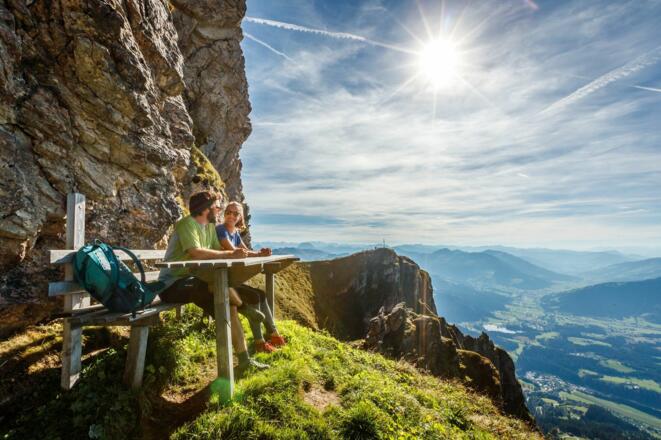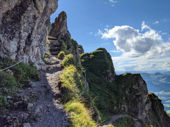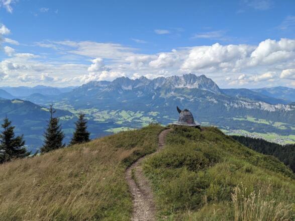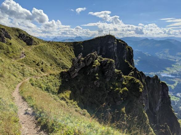 Beim Abstieg wandern Sie bis zur Abzweigung nach St. Johann in Tirol, vorbei an einem markanten Aussichtskreuz auf ca. 1.900 Meter Seehöhe und am selben Weg retour. Hier zweigt ein mit Seil gut gesicherter Steig durch steiles Gelände ab (alternativ zum Scheibersteig kann der leichtere, aber längere beschilderte Hornrundwanderweg gewählt werden). Ein spektakulärer Wegabschnitt an der Nordwestseite des Kitzbüheler Horns!
