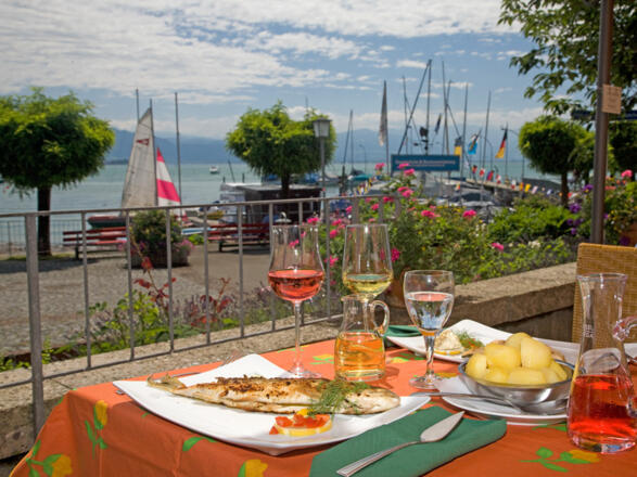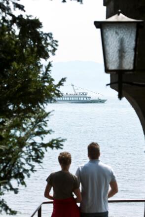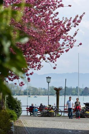 Mit dem Zug bis Haltestelle Wasserburg, von dort 100m Richtung Ortsmitte zum Lindenplatz. Der Ausschielderung auf die Halbinsel folgen.