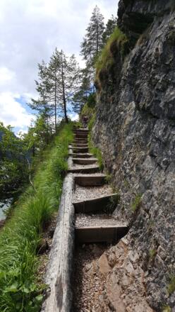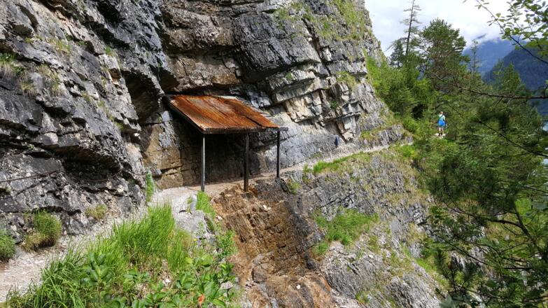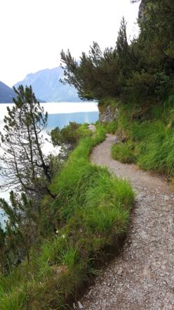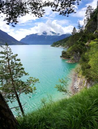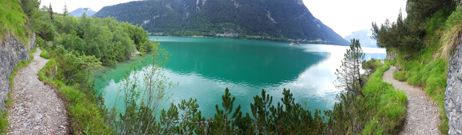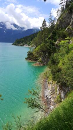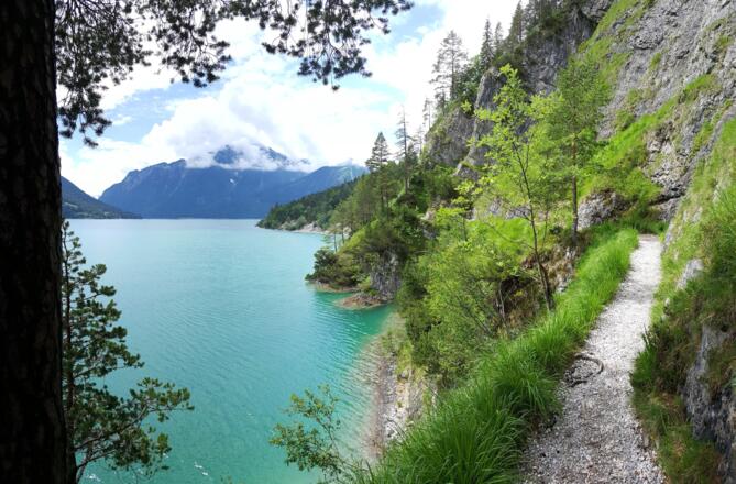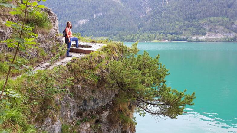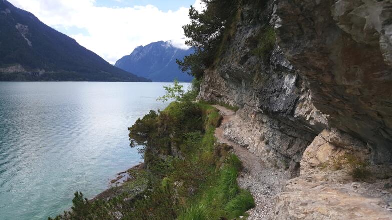Die Wanderung an der Westseite des Achensees verläuft immer in Sichtweise des Sees und hat nur eine geringe Steigung. Allerdings sind die Pfade, die teilweise in den Fels gehauen sind, nicht ungefährlich und erfordern Trittsicherheit.