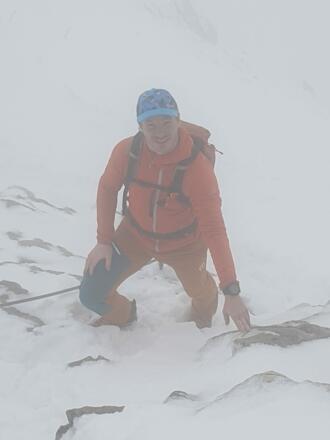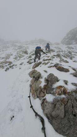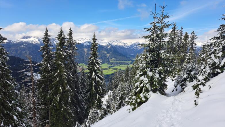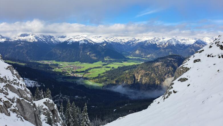 Wir starteten wir beim Parkplatz in Lumbach bei Grän unsere Tour auf den Aggenstein. Da es die Tage zuvor noch einmal Neuschnee gab, hatten wir ab einer Höhe von 1500 Metern eine geschlossene Schneedecke. Beim Aufstieg zur Bad Kissinger Hütte herschte noch gute Sicht bei hohen Wolken und auch stellenweise Sonne. Mit Ankunft auf der Hütte begannen sich die Wolken zu verdichten und schränkte die Sicht nach und nach ein. Trotzdem entschlossen wir uns das letzte Stück zum Gipfel zu wagen. Hier erwartete uns deutlich mehr Schnee mit teilweise bis zu 30cm. Da bereits gespurt war, kamen wir auch zügig voran. Die Drahtseile des seilversicherten Stücks im oberen Teil des Weges waren jedoch bis auf eine kleine Stelle frei von Schnee und auch der Schnee war gut trittfest. Da sich uns am Gipfel kein Ausblick bot, traten wir nach einem Gipfelfoto den Weg zurück zur Hütte an. Nach kurzem Mittagessen stiegen wir auf gleichem Weg wieder ab zum Parkplatz, ehe wir auf knapp 1400 Meter die Wolkendecke hinteruns liesen.