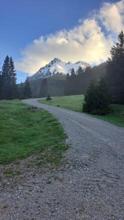 Vom Parkplatz aus geht es zuerste auf einem Fahrweg aufwärts, ehe man schon schnell auf einen Pfad abbiegt. Nach kurzem Stück quert man denn Fahrweg, ehe man in später noch einmal quert. Weiter geht es auf einem guten Pfad bis und einigen Serpentinen im oberen Teil, ehe man den Sattel-Böser-Tritt erreicht. Hier biegt man nach Links ab zur Bad Kissinger Hütte und dem Aggenstein.