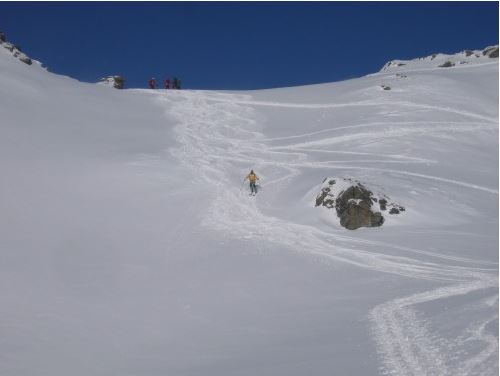 Bei sicherer Schneelage abfahrt direkt über den Südhang , sonst Varianten entlang der Aufstiegsroute oder man nimmt den Schafsiedel noch mit, ist dieser vom Gipfel aus in wenigen Minuten einfach erreichbar und kann auf dessen Aufstiegsspur zur Hütte bzw. sogar ins Manzenkar abgefahren werden (siehe Beschreibung alpintouren). Von dieser Seite ist ein Gipfelanstieg zur Aleitenspitze ebenso möglich, sogar etwas einfacher, aber bei der „Direkten“ auch viel im Schatten.