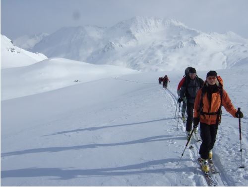 Schitouren- und Notfallausrüstung (LVS, Schaufel, Sonde, Biwak, Erste Hilfe), eventuell Harscheisen
