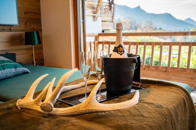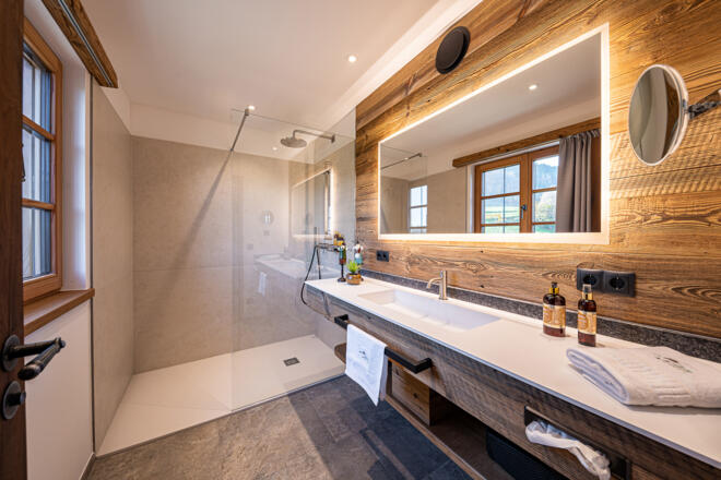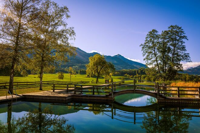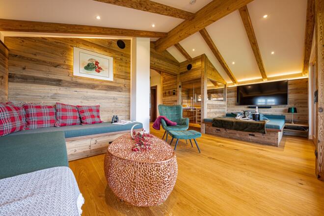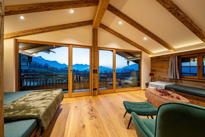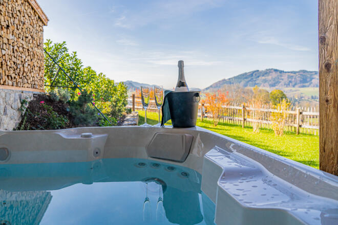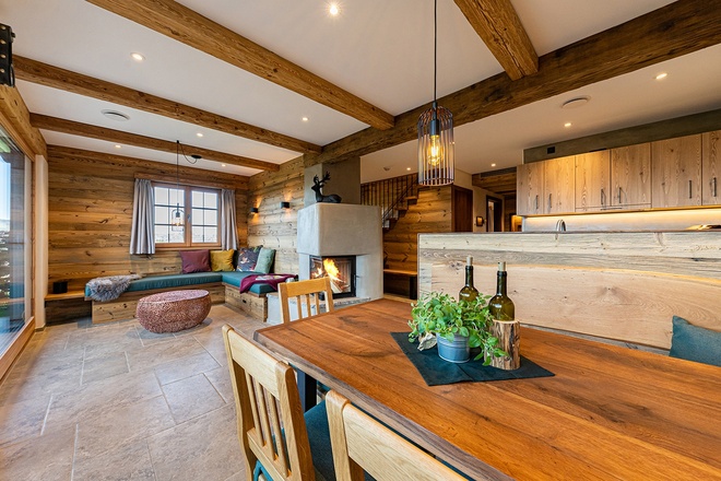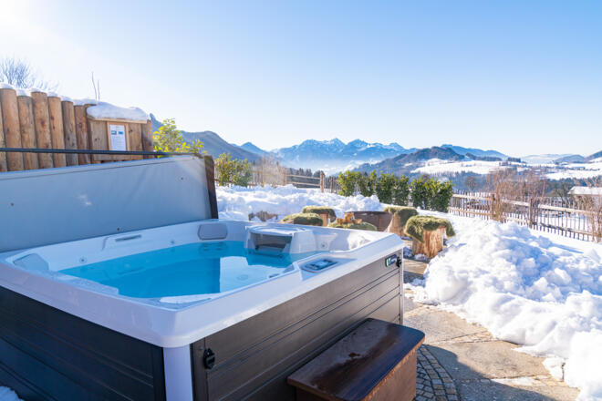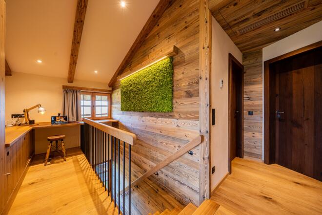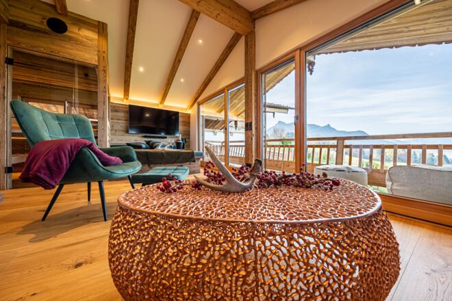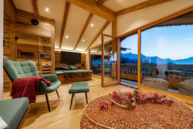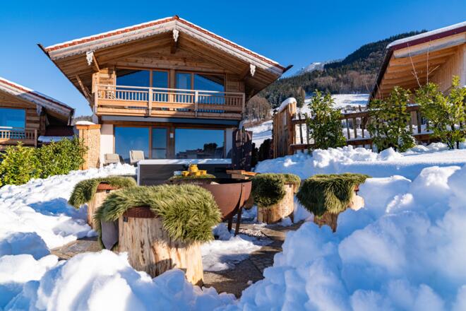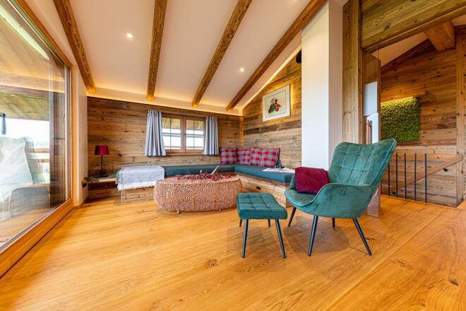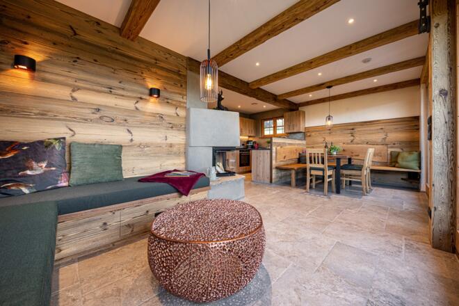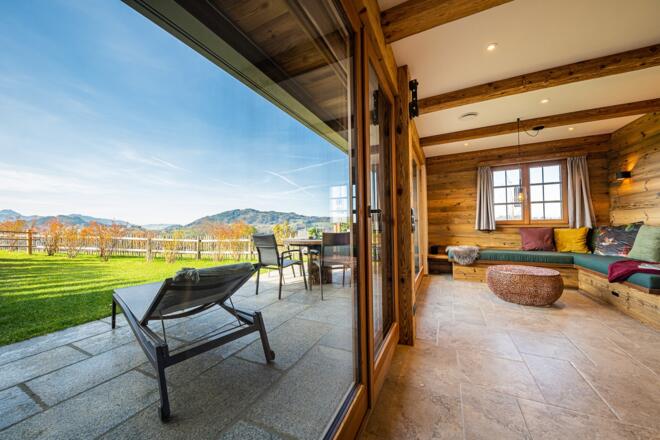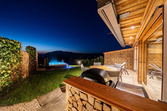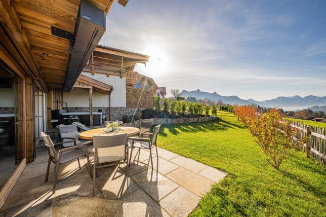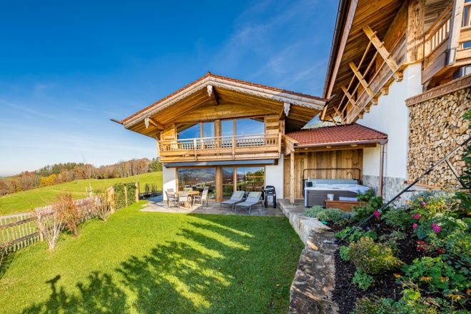 Zwei elegant-gemütliche Ferien-Chalets (Fertigstellung ca. Nov 2021) mit hochwertigsten, natürlichen Materialien und viel Liebe zum Detail erbaut, ermöglichen bei traumhaftem Bergblick in intakter Umgebung die perfekte Erholung - im Frühling, im Sommer wie auch im Herbst. Jede Jahreszeit hat hier Ihren eigenen, malerischen Charme und die Alm-Chalets sind der perfekte Ausgangspunkt für ausgiebige Wanderungen und Radtouren. Im Winter bieten sich ganz in der Nähe Rodeln, Schneewanderungen, Ski/-touren und Langlaufen an. Pro Alm-Chalet können sich vier Gäste auf 130 qm (EG und 1. OG mit Balkon) auf eine bestens ausgestattete Küche, hochwertige- nach traditioneller Handwerkskunst hergestellte Möbel in zwei Schlafzimmern (Boxspringbetten), einen lichtdurchfluteten Essbereich, eine Sauna/Infrarotkabine mit großer Ruheliege, einen privaten beheizten außen-Whirlpool (inkl. Sonnenliegen) und einen Grillplatz(Feuerschale mit Grillplatte) im privaten Garten und extra Weber Elektrogrill auf der Terrasse freuen. Wir freuen und schon und geben uns die größte Mühe, die Wohnung im 5-Sterne-Standard für sie auszustatten.