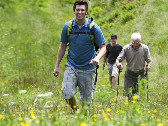 Wanderausrüstung für leichte und mittelschwere Wege, entsprechende Bekleidung der Witterung angepasst.