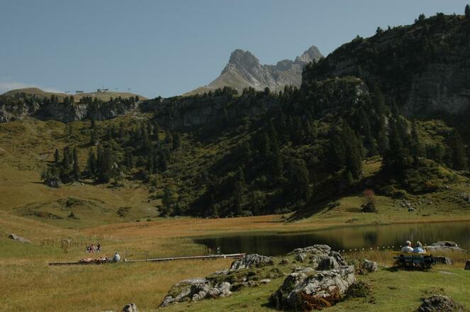 Von der Bergstation (1870 m) im Gebiet der Steffisalpe führt der Weg vorbei am Wannenkopf (1941 m) hinunter nach Bürstegg, der ersten Walsersiedlung im Gebiet von Lech. Über den Karbühel und Auenfeldsattel erreicht man mit schönen Blicken auf die Berggipfel von Juppenspitze (2412 m) und Mohnenfluh (2542 m) die Untere Auenfeldalpe. Entlang der Bregenzerach, die sich hier schön durch das moorige Auenfeld schlängelt, erreicht man die Batzenalpe und bald darauf das Naturjuwel Körbersee. Von hier führt der Wanderweg zum Hochtannbergpass (1676 m) nahe dem Kalbelesee und der Körbalpe, einer großen Galtalpe. Rückfahrt mit dem Bus nach Warth (Landbus Linie 40a).