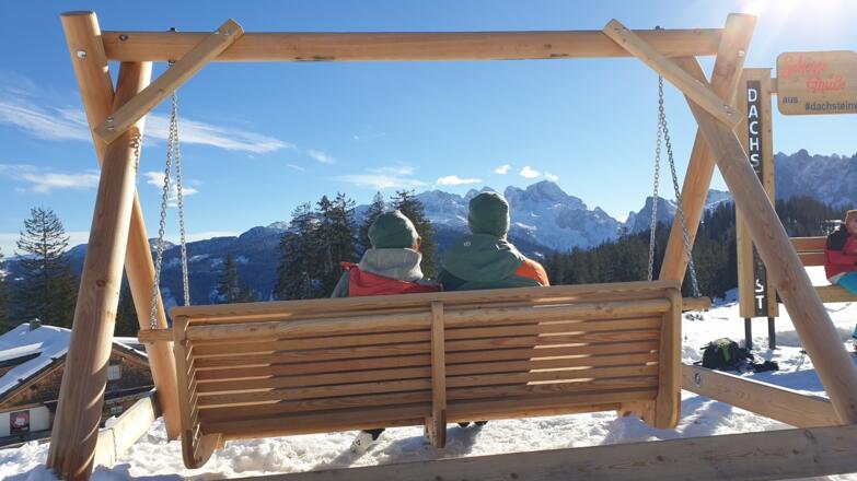 Wir folgen den Weg, der jetzt wieder ein Stück durch den Wald führt bis wir oben wieder den Pistenrand erreichen. Dann geht es wieder links durch das Gelände bis wie oben wieder die Piste und die Bergstation der Hornbahn erreichen. Hier gibt es einen Fotopoint mit gemütlichen Sesseln und atemberaubenden Dachstein und Gosaukammblick.