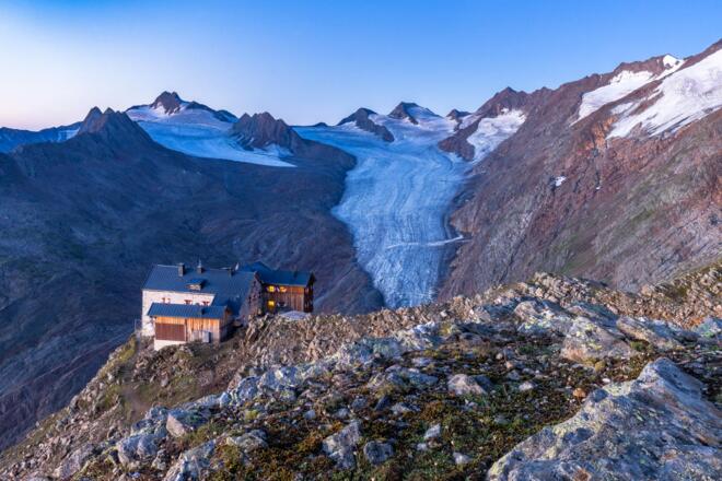 Ramolhaus: Die Alpenvereinshütte der Sektion Hamburg und Niederelbe wurde zwischen 1881–1883 erbaut. Sie thront auf einem markanten Felsen über der Gletscherzunge des Gurgler Ferners auf 3006m.