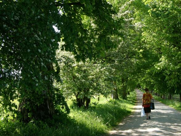 Vom Bahnhof aus gehen wir nordwärts die Wallenburger Straße entlang und den baumreichen Wallenburger Berg hinauf und wandern unter der schattigen 'Wallenburger Allee', die teilmeise mit einem holprigen Kopfsteinpflaster versehen ist, auf Schloß und Gut Wallenburg zu.