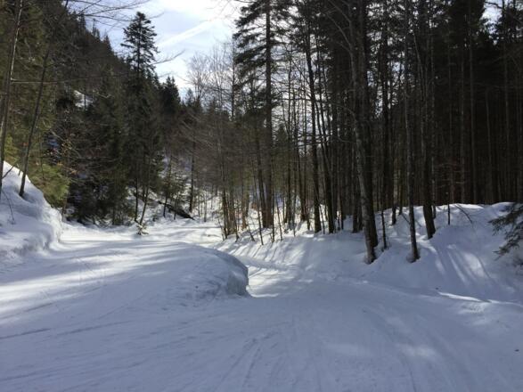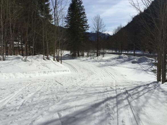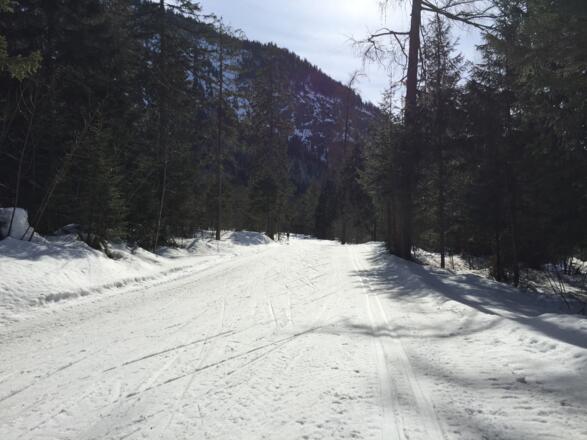 Ebener Einstieg zur Loipe in Bayrischzell gegenüber der Sportalm. Die Strecke bis zum Stockerparkplatz hat drei Anstiege die im Langlaufschlitten ganz schön Kraft erfordern. Die Loipe führt ins Ursprungstal über Wiesen und durch den Wald bis zum Stocker Parkplatz.