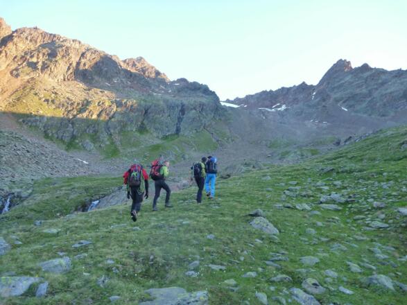 Gut sichtbar wird nun der Felsriegel, der den Zugang zum Hinteren Eiskastenferner versperrt. Überraschend einfach lässt sich dieser an der rechten (orografisch linken) Seite durchsteigen. Über Blockwerk und Möränenschutt bis zum Beginn der Felsplatten, noch rechts davon aufwärts, dann nach links queren und zwischen den Felsplatten in wenigen Serpentinen, immer den leichtesten Weg wählend (eine Stelle 2+), zum Fuß des Ferners.