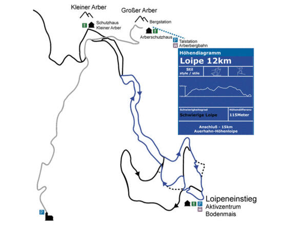 Blaue MarkierungVom Start bis km 1 leichtes Gelände, von km 1 - 3 mittelschwere Anstiege und Abfahrten, von km 3 - 4,5 anspruchsvoller Anstieg, leichte Abfahrt bis km 6, mittelschwerer Anstieg bis km 7, ebenes Gelände mit leichtem Anstieg bis km 9, mittelschwere Abfahrt und Anstieg bis zum Ziel.Am Arberhüttenschachten befindet sich der Kontrollstempel für den Bodenmaiser Langlaufnadel.Abwechslungsreiche Loipe mit vielen landschaftlichen Highlights.