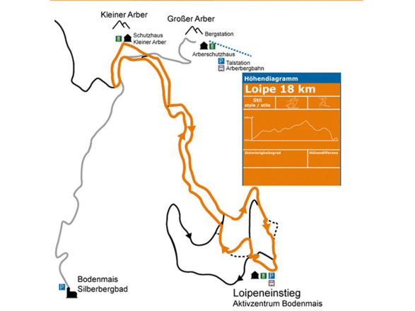 Orange MarkierungVon km 1 - 7 ist die Strecke identisch mit der rot markierten 15 km Loipe. Dann weiter ca. 1 km leicht, plus einem 1 km langen mittelschweren Anstieg, bis zum Schutzhaus Kleiner Arber (Chamer Hütte). Nach 2 Flachstücken und einer kurzen steilen Abfahrt gliedert sich die Strecke wieder in die rote Loipe ein. Der Kontrollstempel für die Bodenmaiser Langlaufnadel befindet sich am Eingang zur Chamer Hütte . Dichter Wald, freie Flächen mit herrlichen Aussichten, abwechslungsreiches Gelände und eine gemütliche Einkehrmöglichkeit, ob sportlich ambitioniert oder Genussläufer für jeden ist bei dieser Tour was dabei.