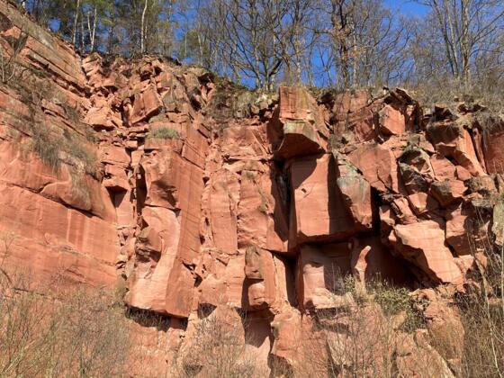 Der Wegabschnitt startet an der neuen Mainbrücke und führt an einer Galerie von Steinbrüchen entlang, deren Großteil seit 1983 unter Naturschutz steht. Diese Landschaft ist in den Karten und im Volksmund als „Mainhelle“ oder „Mainhölle“ bekannt. Ein Begriff, der sich von der hell-leuchtenden Farbe des Sandsteins ableiten dürfte. Die Brüche zeugen von der Abbaumethode des Sturzverfahrens, bei dem ganze Wände nach vorheriger Unterhöhlung gesprengt und zum Einsturz gebracht wurden. Man sieht gut, dass der Sandstein kein geschlossenes Gefüge darstellt, sondern durch Schichten, Spalten und Klüfte unterteilt ist. Die teils überhängenden Felspartien machen deutlich, dass von den instabilen Wänden auch heute Gefahren ausgehen. Bitte halten Sie unbedingt Sicherheitsabstand. Auch aus der Distanz sind die Steinbrüche beeindruckend genug.