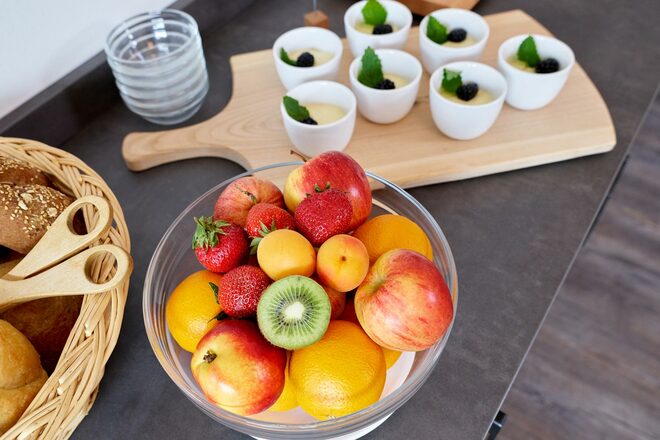Unser reichhaltiges Frühstücksbuffet – an dem Sie eine große Auswahl an frischen, regionalen Brot-, Wurst- und Milchprodukten vorfinden – können Sie in angenehmer Atmosphäre nach Herzenslust genießen. Eine Müsli- und Nussecke, frisches Obst der Saison, Honig und Marmeladen runden Ihr Frühstücksangebot ab.
