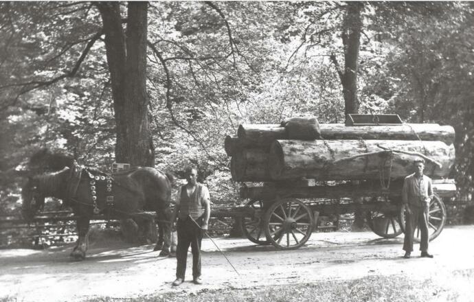 Holztransport auf dem Landweg mit von Pferden gezogenen Fuhrwerken
