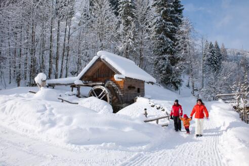 Die kleine Dorfmühle befindet sich am Spazier- und Skiweg in Mühlbach neben der Bundesstraße gegenüber der Gemeinde.