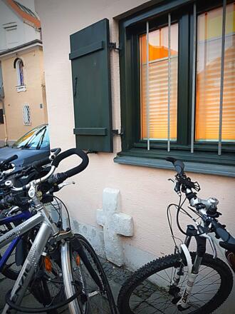 An einer der Hauswände, hinter den Fahrradständern, kann man das gemauerte Pestkreuz finden. Dieses Kreuz erinnert vermutlich an die Pestepidemie, die von 1517 bis 1519 dauerte.