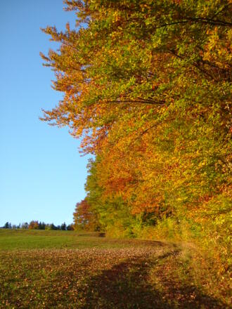 Rand, am Straßenabzweig nach Palnkam vorbei, mit leichtem Gefälle in den "Teufelsgraben", einem Trockental, in dem einst die Schmelzwasser des letzten Isargletschers abflossen.