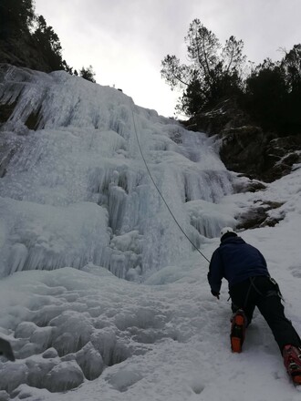 Der Eisfall kann in drei Etappen unterteilt werden, welche jeweils einen eigenen Zustieg haben sowohl auch in einem durchgestiegen werden können. Die kurzen Einheiten (ca. 32-40m) bieten erade für Einsteiger eine ideale Übungsmöglichkeit. Zudem kann die erste Einheit mit Umlenkungsmöglichkeiten an Bäumen gut toprope gesichert werden.