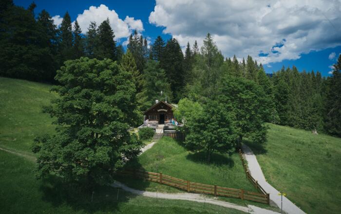 Vom Schloss der Mautstraße talauswärts folgen, dann direkt auf den Schotterweg der von der Mautstraße links abzweigt folgen und nach 200m links über den Bach queren. Vorbei am "Spindlerhaus" einem steilen Weg, durch einen Bergwald - direkt hoch zur Elmauer Alm. Kurz bevor die Alm erreicht wird, öffnet sich der Wald und gibt einen grandiosen Ausblick auf das Karwendel und Wettersteingebirge frei.