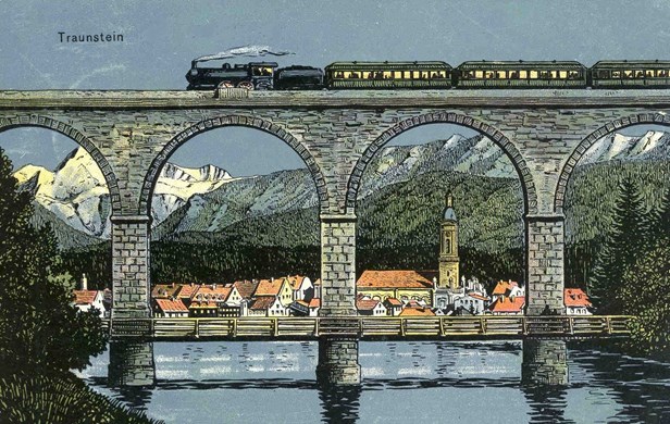 Seit 1854 plante man den Bau einer Eisenbaulinie von München über Traunstein bis Salzburg. Die Eisenbahnbrücke in Traunstein wurde schließlich am 12. August 1860 feierlich eingeweiht. Seither rollten unzählige Züge über das Viadukt.