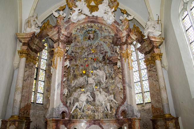 Was weiß uns diese kleine Kirche doch für Geschichten zu erzählen. Beginnen wir beim sehr seltenen Patrozinium, das an die Siebenschläfer von Ephesus erinnert. Auf der Südseite der Kirche sind in der Kirchenmauer römische Grabsteine eingebaut. Womöglich haben diese Darstellungen (einmal drei, einmal vier Personen) zum Patrozinium geführt. Nicht nur deswegen haben Archäologen die Kirche im Blick. Unter anderem wurden bei Arbeiten anfangs der 2000er Jahre mehrere Skelette und römische Grabsteine aufgefunden. Der Hauptgrund für einen Besuch liegt aber ohne Zweifel für die meisten Besucher heute im Inneren der Kirche. Wie der Band „Die Kunstdenkmäler in Bayern“ zu berichten weiß, gab es bereits 1188 eine Kirche in Rotthof. Die heutige wurde 1484 erbaut und 1506 geweiht. Die kleine spätgotische Kirche liegt schön auf einer Anhöhe. Der Innenraum besticht durch den Hochaltar, der aus der Meisterwerkstatt von Johann Baptist Modler stammt und auf das Jahr 1758 zurückgeht. Modler verwendet in seiner Komposition einfache Mittel, unter anderem Tuffstein und Muschelwerk, und lässt den Betrachter durch grandiose Illusion in jene Grotte eintauchen, die die Heiligen Siebenschläfer nach ihrer Flucht in zwangloser Haltung auf Felsen zeigt. Erst nach 200 Jahren, so heißt es, erwachten sie und entgingen so der Christenverfolgung unter dem römischen Kaiser Decius.