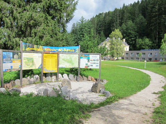 Bis ins Salzatal wandern wir am Nationalpark Themenweg „Natur-Spuren“, der von der Villa Sonnwend bis hinauf auf den Wurbauerkogel zum Nationalpark Panoramaturm führt. Wir folgen also dem Themenwegsymbol mit dem Feuersalamander. Bei regnerischem Wetter oder an feuchten Stellen kann man zahlreiche dieser kleinen Kerlchen auf ihren Wanderungen beobachten.