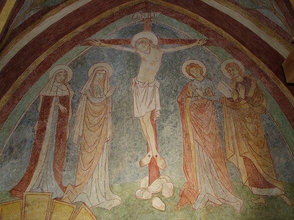 Äußerlich eher schlicht, überrascht die im 14./15. Jahrhundert entstandene Kirche durch sehenswerte Wandmalereien (1340/50) im Chor. Diese stellen neben ornamentalen Motiven auch klar umrissene Figuren