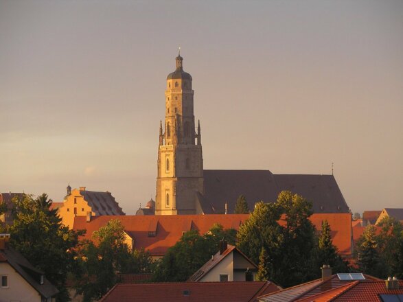 Als eine der letzten großen Hallenkirchen der Spätgotik zwischen 1427 und 1505 aus Suevit erbaut. Äußerlich bis auf die Portale und den 90m hohen Glockenturm „Daniel“, in welchem bis heute ein Türmer lebt, eher schmucklos. Die Kirchenausstattung stammt aus verschiedenen Epochen. Besonders erwähnenswert ist das Altargehäuse des ursprünglichen Herlin-Altars von 1462 (die zugehörigen Seitenflügel befinden sich im Stadtmuseum). In ihm standen einst die von Nikolaus Gerhaert von Leyden geschaffenen Figuren des heute barocken Hochaltars. Beeindruckend sind außerdem das kunstvoll geschnitzte, spätgotische Chorgestühl und die reich verzierte und bemalte Seitenorgel aus der Zeit des Frühbarock. An den Umfassungswänden der Kirche befinden sich zahlreiche Grabsteine, Totenschilde und Epitaphien.