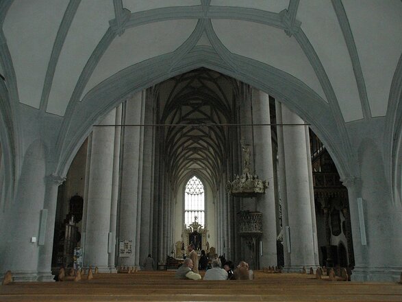 Als eine der letzten großen Hallenkirchen der Spätgotik zwischen 1427 und 1505 aus Suevit erbaut. Äußerlich bis auf die Portale und den 90m hohen Glockenturm „Daniel“, in welchem bis heute ein