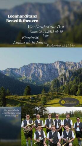 Heuer findet wieder der traditionelle Leonharditanz im Postsaal statt. Für musikalische Unterhaltung sorgt "Blechlastig"Barbetrieb ab 21:00 Uhr, Einlass ab 16 Jahren.