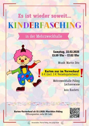 Es ist wieder soweit.....Kinderfasching in der Mehrzweckhalle Piding, am Sonntag, 22.02.2025 von 13:59 Uhr bis 17:02 Uhr.Karten nur im Vorverkauf!6,00 € (incl. 3,00 € Verzehrgutschein)Nähere Informationen erhalten Sie auf der Website des Pfarrverbandes Anger-Aufham-Piding. http://www.pv-aap.de