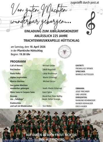 Die Trachtenmusikkapelle Hüttschlag lädt Sie herzlich zum Jubläumskonzert 2026 ein. In diesem Jahr feiert die Musikkapelle ihr 225-jähriges Jubiläum. Es erwartet Sie ein vielseitiges Programm mit besonderen musikalischen Highlights.