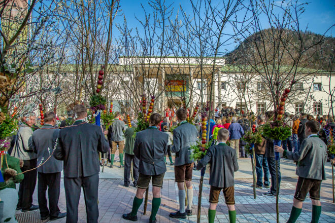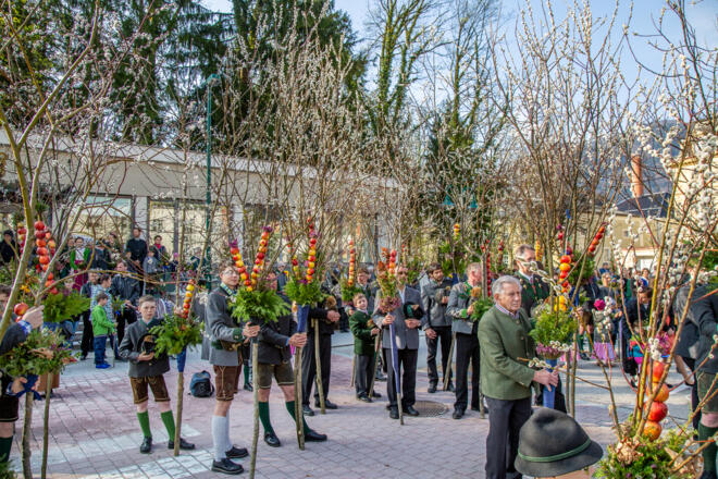Die jungen Buben haben den 'Stanglpalm', einen aufwändig gebundener Buschen auf einem Holz-Stecken. Frauen tragen in der Hand den einfachen 'Palmbuschen'.