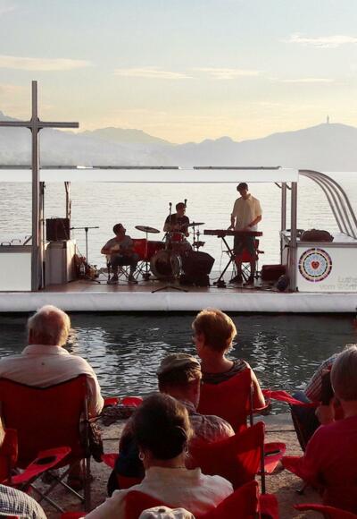 Im Strandpark vor dem Strandbad Leopold in Velden am Wörthersee legt das Kirchenschiff regelmäßig an und lädt Gäste sowie Einheimische zu stimmungsvollen Begegnungen ein.