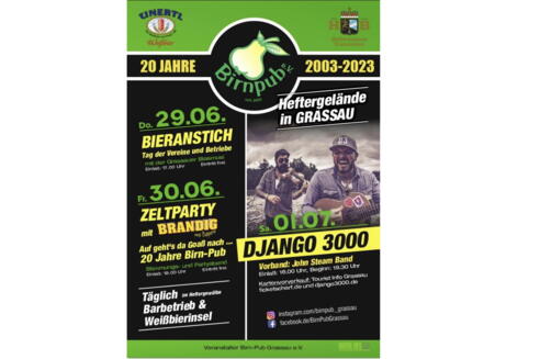 Auf geht´s da Goaß nach ... 20 Jahre Birn Pub! Zeltparty mit der Band Brandig. Weißbierinsel im Außenbereich, Barbetrieb im Hefter-Gewölbe. Einlass ab 18:00 Uhr, der Eintritt ist frei.