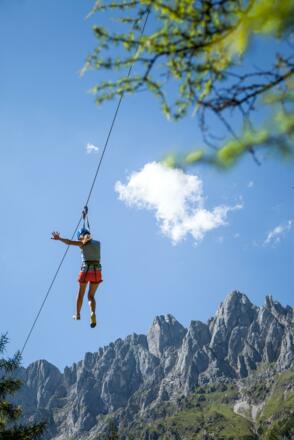 Mit dem Wanderbus geht es dann zum Alpinpark in Dienten. Dort warten Siegi und die Steinböcke auf uns. Klettern an der Felswand, an der Staumauer und im Hochsailgarten.
