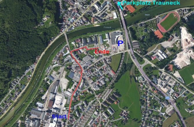 Start beim Gasthof Auerhahn, entlang der Bahnhofstraße bis zum Bezirksseniorenheim.