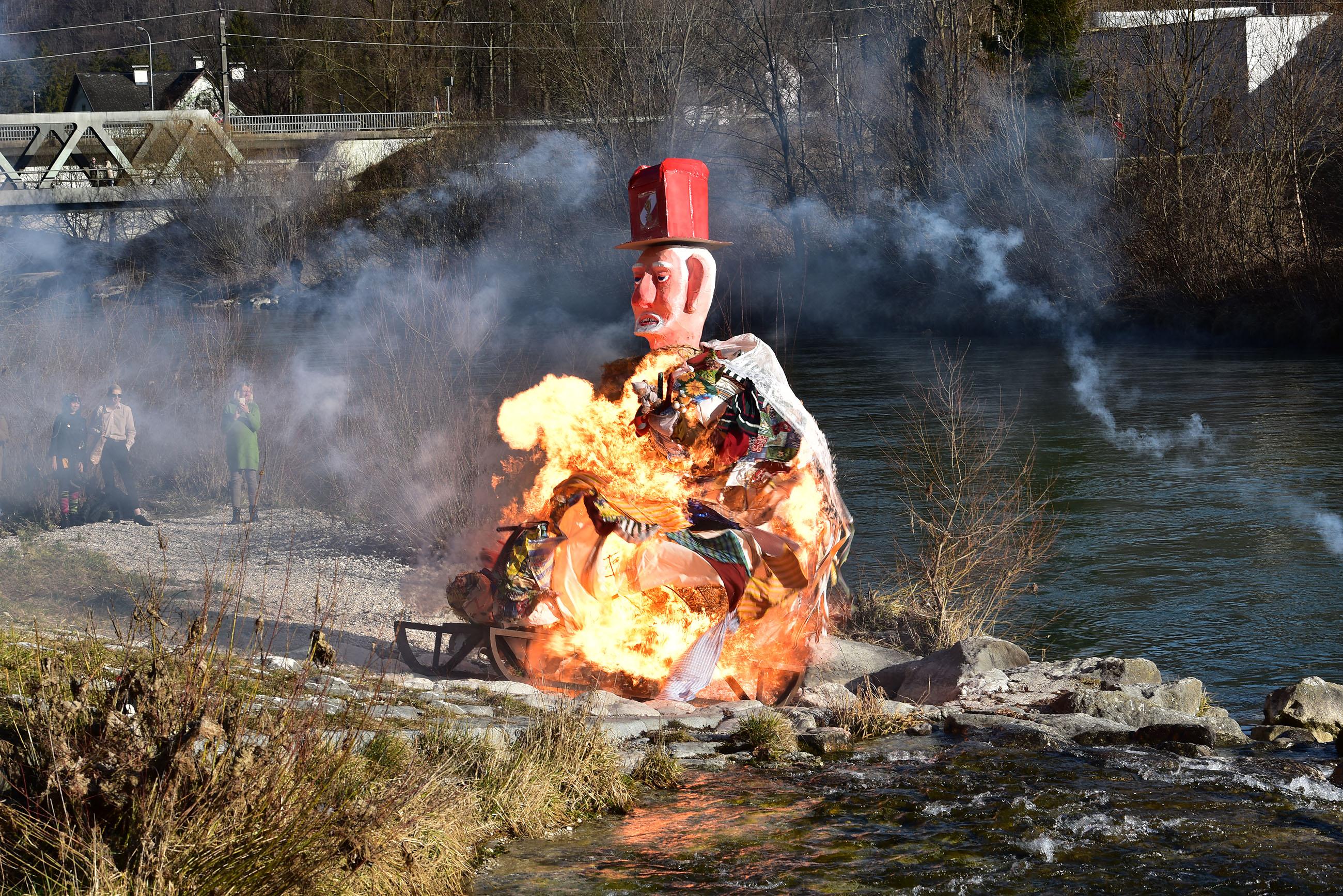 Die Fetzenfigur, die den Ebenseer Fasching symbolisiert, wird unter Trauermusik zum Traunufer getragen und dort verbrannt.