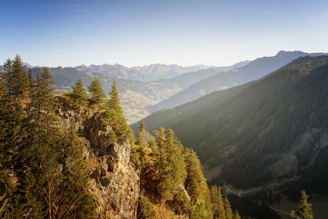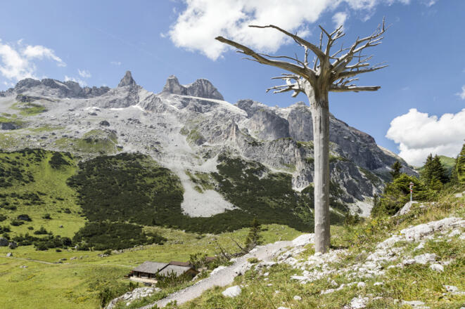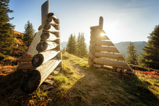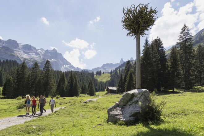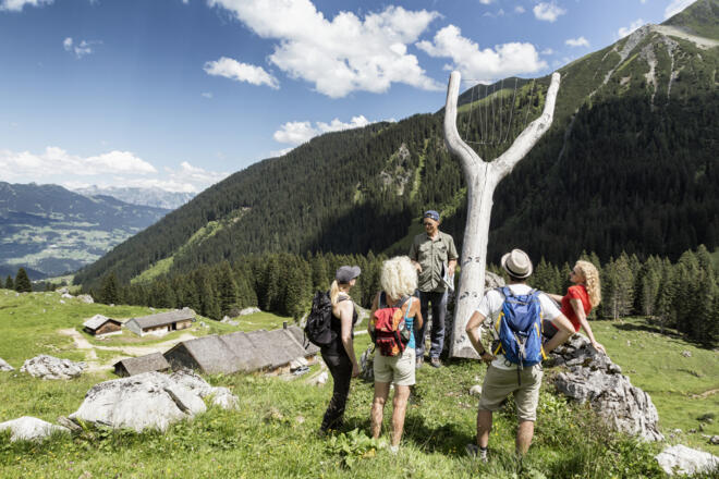 Nicht nur die atemberaubende Aussicht auf die imposante Gebirgskulisse, sondern auch die vom heimischen Künstler Roland Haas gestalteten Holzskulpturen machen diese Wanderung zu einem einzigartigen Erlebnis mit spannenden Einblicken in das Hirtenleben und die jahrhundertealte Montafoner Maisäßtradition.