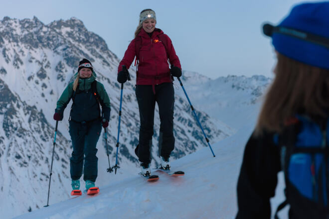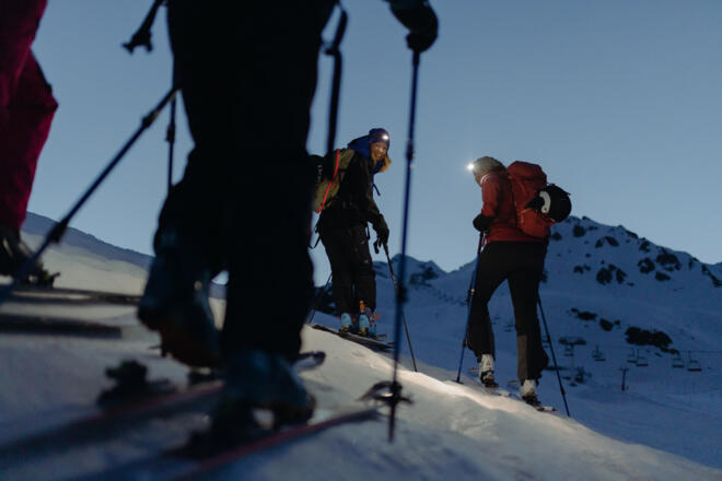 Spüren, wie die Natur im Skigebiet abends zur Ruhe kommt. Bei einer Jause auf dem Schafbergplateau den Sonnenuntergang erleben, Im Lichtkegel der Stirnlampe ins Tal abfahren. Skiexkursion mit technischer Einweisung zum Skitourengehen und informationen zum Skigebiet.
