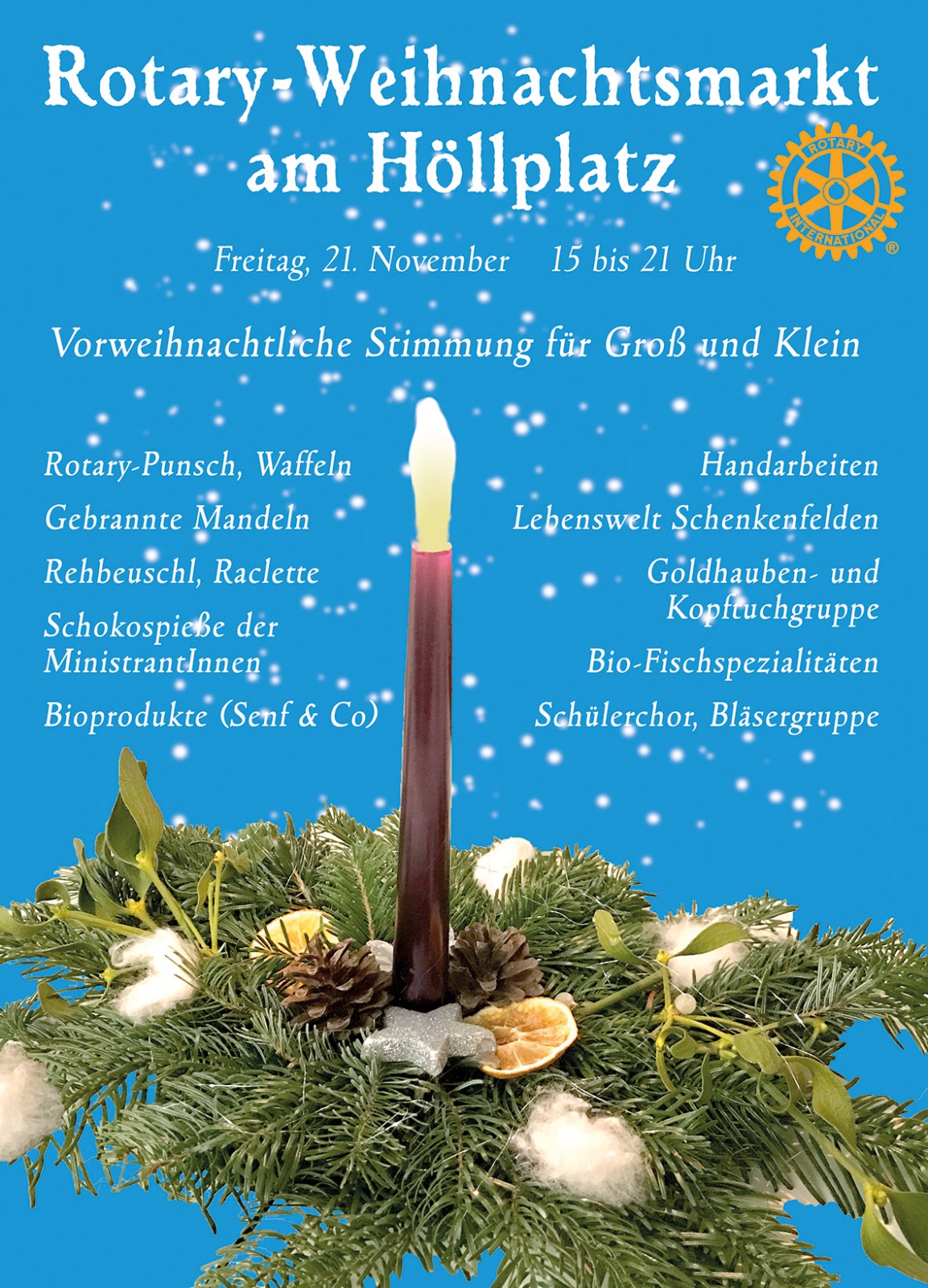 Am Fr, 21. November lädt der Rotary Club Freistadt zum Weihnachtsmarkt am Höllplatz ein. Vorweihnachtliche Stimmung für Groß und Klein. Die Goldhauben- und Kopftuchgruppe, die Lebenswelt Schenkenfelden und MinistrantInnen, sowie weitere Aussteller heißen Sie herzlich Willkommen. Es erwartet Euch herrliche Köstlichkeiten wie Waffeln, Gebrannte Mandeln, Rehbeuschl, Raclette, Schokospieße, Bioprodukte und Bio-Fischspezialitäten u.v.m. Für musikalische Umrahmung sorgen die Bläsergruppe und der Schülerchor.