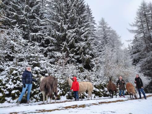 Zu Beginn gibt es eine kurze Einführung: Die Tiere werden vorgestellt, der Umgang gezeigt und das Führen der Lamas erklärt. Danach führt ein Lama jeweils eine teilnehmende Person auf einem ruhigen Weg durch verschneite Wälder und über sanfte Alpenhänge. Die Landschaft rund um Hirschegg‑Pack in der Erlebnisregion Graz bietet klare Winterluft, ruhige Natur und eine harmonische Stimmung.