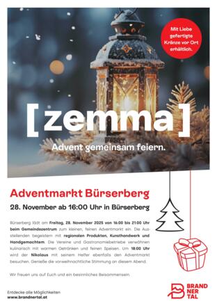 Bürserberg lädt zum kleinen, feinen Adventmarkt ein. Die Ausstellenden begeistern mit regionalen Produkten, Kunsthandwerk und Handgemachtem. Kulinarisch verwöhnen die lokalen Vereine und Gastronomiebetriebe mit warmen Getränken und feinen Speisen. Um 18:00 Uhr wird der Nikolaus mit seinem Helfer ebenfalls den Adventmarkt besuchen.