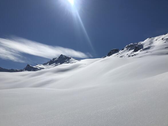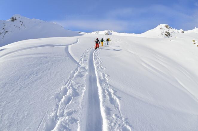 Von St. Antönien aus geht es mit dem Bus und der Rhätischen Bahn ins Skigebiet Klosters. Hier nutzen wir die Bergbahnen, um den Aufstieg ins Schlappiner Joch (2.203 m) auf rund 200 Höhenmeter zu verkürzen. Vom Schlappiner Joch führt eine lange Abfahrt über mittelsteile Hänge ins Valzifenztal und schließlich zurück nach Gargellen. Dort lassen wir die beeindruckenden Erlebnisse bei einem gemütlichen Einkehrschwung Revue passieren.